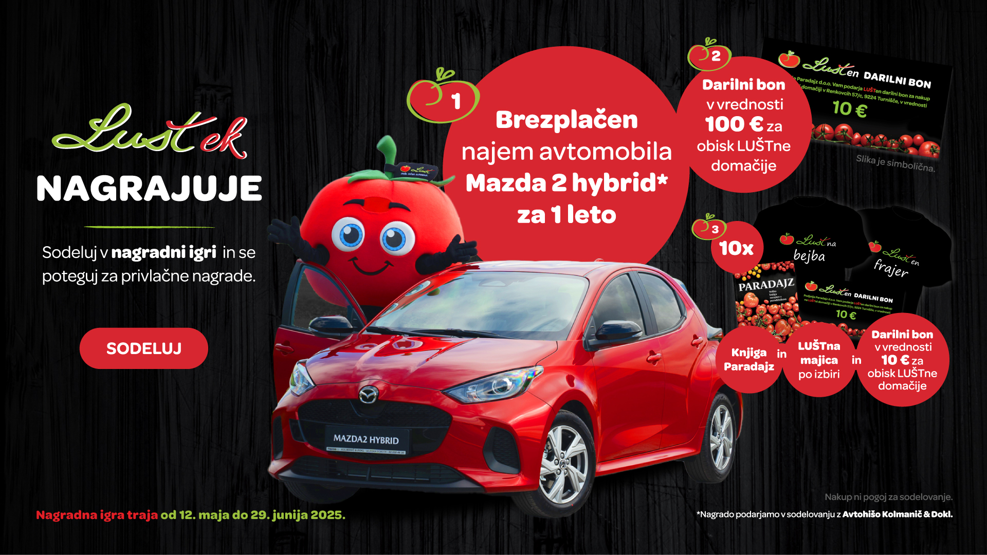 LUŠTek nagrajuje! ZaLUŠTaj si paradižnik LUŠT in z malo sreče postani LUŠTen/na voznik/ca nove Mazde 2 hybrid* za eno leto ali se poteguj za druge privlačne nagrade! Opravi nakup paradižnika LUŠT v skupni vrednosti najmanj 5,00 € z DDV in shrani račun ali zapiši odgovor na vprašanje »Zakaj paradižnik LUŠT priporočate drugim?«