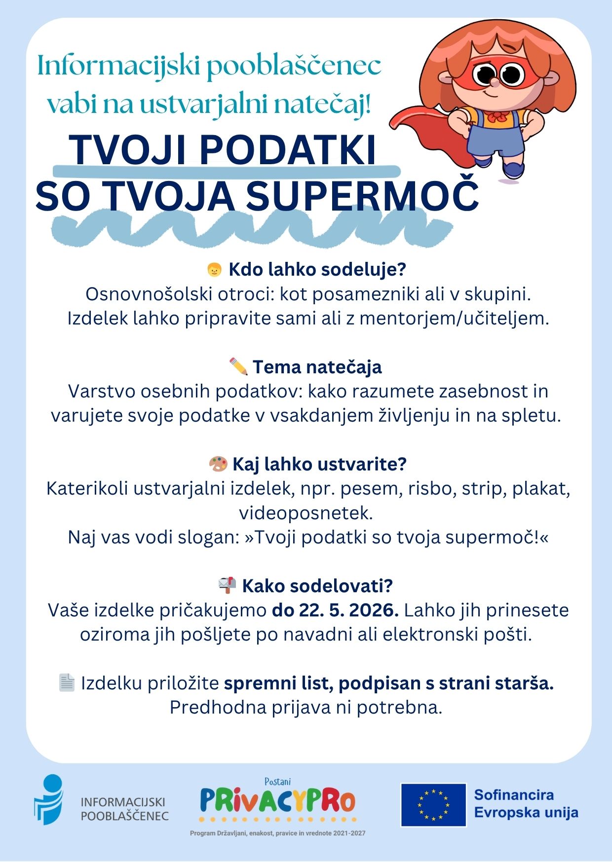 Si se kdaj vprašal/(-a), kdo vse pozna tvoje osebne podatke? Ali pa kaj se zgodi, če jih deliš z napačno osebo? Informacijski pooblaščenec te vabi, da sodeluješ na ustvarjalnem natečaju »Tvoji podatki so tvoja supermoč!«, kjer lahko na zabaven in ustvarjalen način raziščeš prav to!