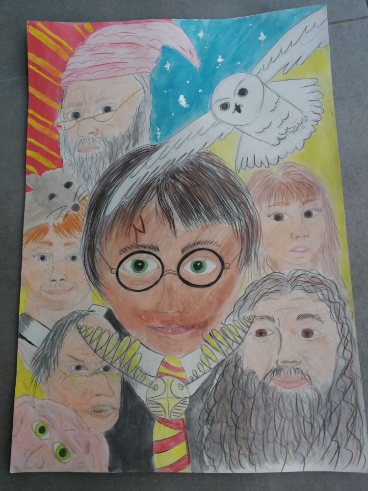 Hojla, kot vidite sem narisala Harryja Potterja z njegovo druščino - Hermiono Granger, Ronom Weasleyem in Hagridom, zraven pa so še Dumbledore, Dobby, goblin iz banke in Harryeva sova Hedvig.