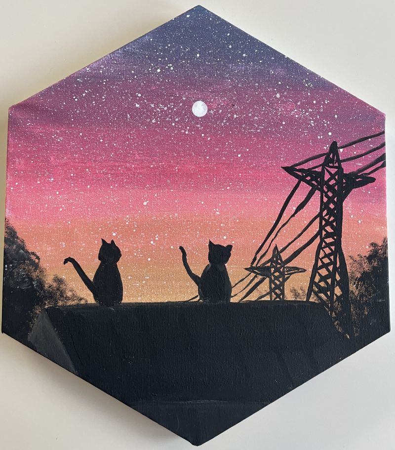 narisala sem sliko sončnega zahoda in mačk, ker na nek način predstavlja mene. Zato, ker imam res rada mačke (mamo velik skupnega predvsem to, da smo lene:joy:) in sončne zahode. Upam, da vam je všeč, bom pa vesela tut kšnega :purple_heart:.