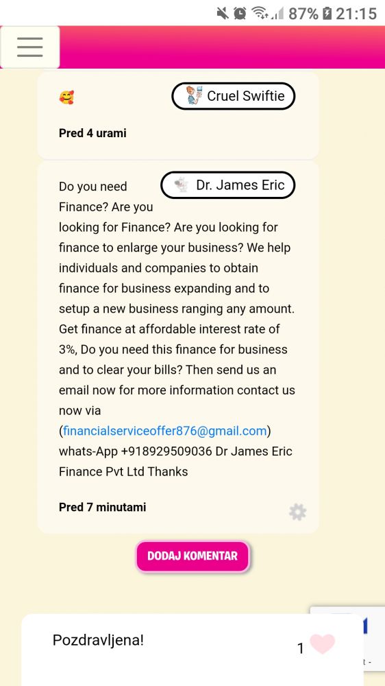 Oki to je ful čudn. Pač oomen kokr neki ali rabiš financiranje, ali gledaš/se zanimaš za financiranje...Mogoče pejt pisat v kotiček Revije PIL. Ne vem dost čudn je. Kokr neka reklama. Al je šel en sam od nek copy paste in se zafrkava ali pa pač ne vem.