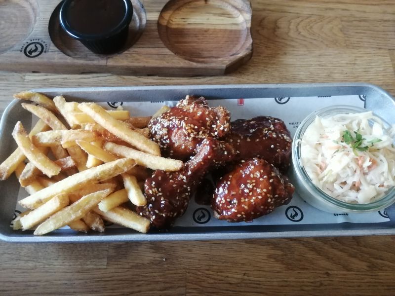 Evo še moj Krožnik jedla sem piščanca v neki azijskij omaki s sezamom, Pomfri in zeleno solato:yum::yum: