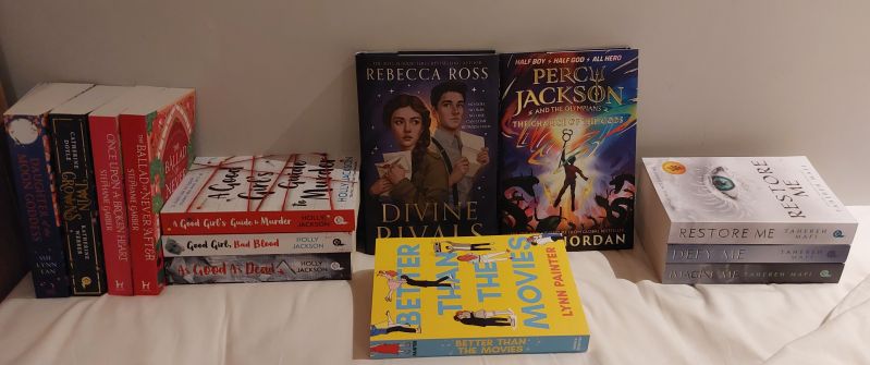 Okej, slika ne prikaže ravno vseh naslovnic, ker ni bilo prostora, ampak tukaj pa samo napišem naslove vseh knjig (če koga kakšna posebno zanima naj se javi v komentarje da povem o čem se gre in po možnosti svoje mnenje, ko jo preberem).