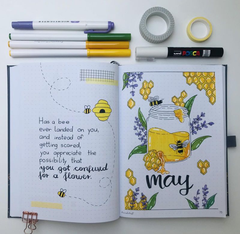 Ojlaa, tukaj je moj bullet journal setup za Maj 2022. Kot vidite so tema čebelice in med! To pa zato ker 20. maja praznujemo Svetovni dan čebel in semizdi, da se je na to zelo pomembno opominjati, ker so čebelice zeloo pomembne za nas. Zato se ta mesec pa tudi celotno leto spomnimo nanje.