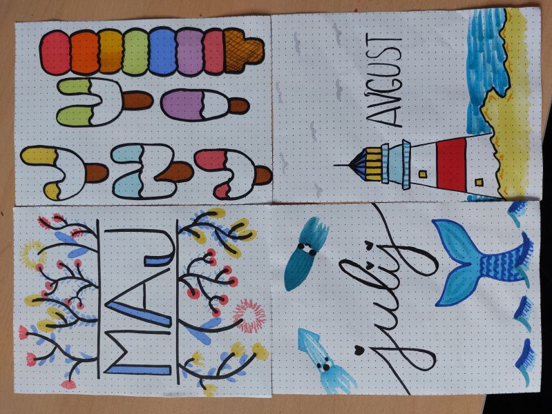 Tukaj imamo naslednje štiri mesece ki so maj, junij, julij in avgust. Začnimo z majem. Za maj sem se spet odločila narediti rožice ampak malo drugačne. Marca so bila bolj cvetoče in vesel, za maj sem se pa odločila za nekaj bizarnih barvnih kombinacij oz. nenaravnih in tako bom tudi nadaljevala v maju. Nato imamo junij. Junija je poletje in vsi jemo sladoled poleti kajneda, zato sem naredila črke kot lučke in zraven je ostalo ravno še dovolj prostora za en velik sladoled s 7 kepicami. Nato imamo juliji ki je spet morsko obarvan. Zgoraj je nekaj meduz. Julij je kaligrafsko napisan s srčki namesto pikic nad črkami, spodaj pa imamo še nekaj valov in rep morske deklice. Avgust, še zadnji poletni mesec oz. zadnji mesec počitnic. Ko pomislim na avgust pomislim na svetilnik, zato sem narisala svetilnik in v odzadju tudi nekaj ptičev. Nasploh je august eden mojih najlepših coverjev za mesece.