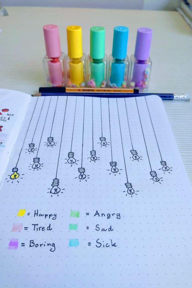 To so barve in vsaka barva pomeni eno čustvo. Lučke oz. žarnice pobarvaš z tisto barvo kot se počutiš.