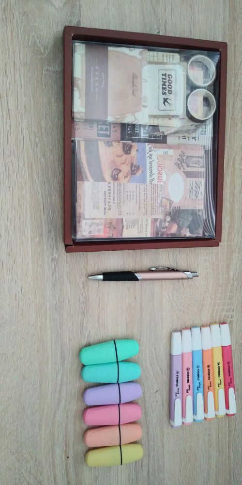 Tole so moje potrebščine za bullet journal. Na levi je komplet vintage sketchbook iz amazona (če koga zanima kej je notri https://amzn.eu/d/f2e0nLd) pa uporabljam zvezek iz tega kompleta. Na desni so markerji (pri zgornjih manjka zeleni ker ga trenutno ne najdem) in kuli.