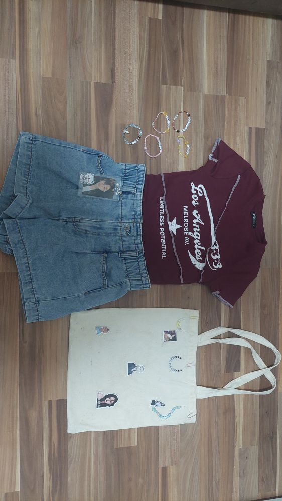 dejmo ne komentirat vrečke okej:sweat_smile: ker je diy. Na drugi strani vrecke pise lover pa gor so roza srcki in ful ne pase k outfitu zato sm jo obrnla pa neke nalepke pa obeske gor dala.