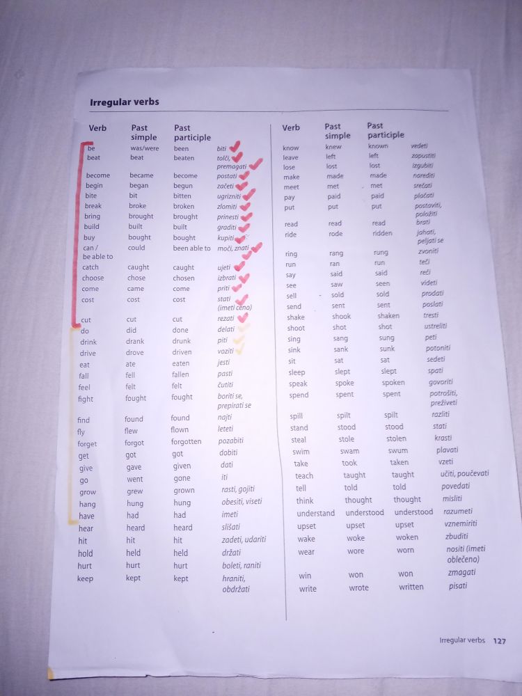Evo TM, tole so vsi nepravilni glagoli. Past Participle pa ne potrebuješ znati, to je za 8.r. Ostalo ti pošljem v nabiralnik<3