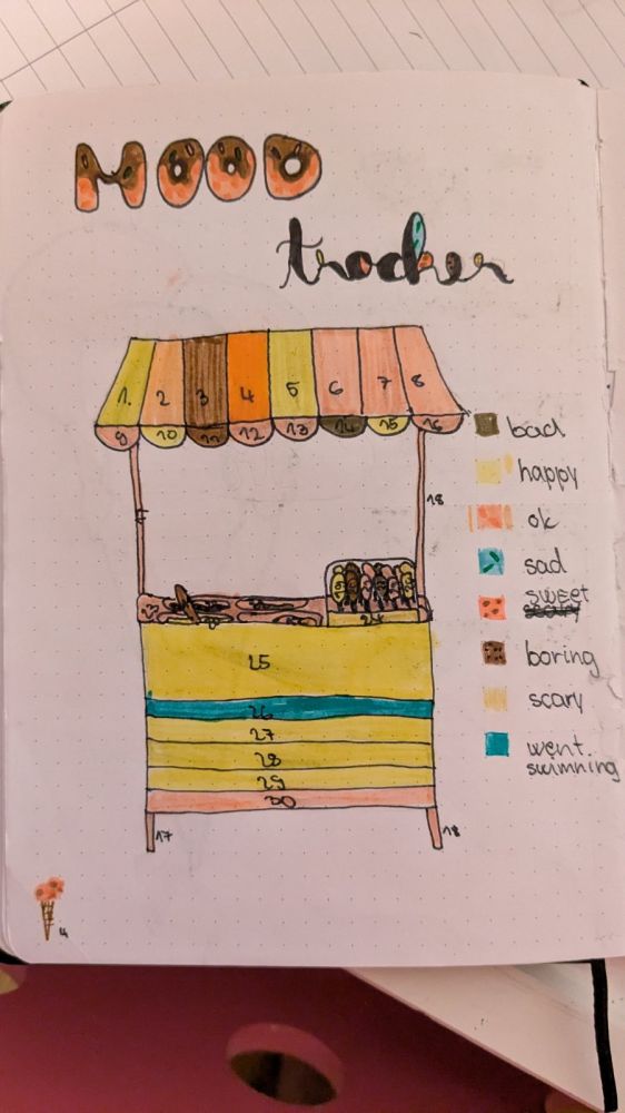 izpolnen mood tracker. večinoma je rumen in roza, ker je moj lajf kr uredu, al pa mam sam nizke standarde za to, kaj je veselo