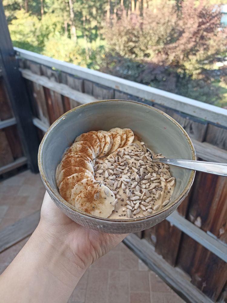 seveda ena perfectly narezana banana s cimetom (definitivno premalo cimeta, ne vem, kaj sem razmišljala) in kot običajno sončnična in chia semena. nisem dodala medu ali kakega drugega namaza, ker se mi ni zdelo potrebno.