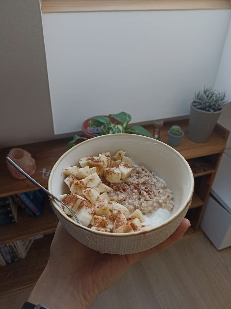 spodaj je grški jogurt (do zdaj sem mela vedno raje navadni jogurt, ampak tale je neki drugacen (mislim, da z manj vsebnosti maščobe) pa je zlo dober), potem so topli ovseni kosmiči, oziroma oatmeal znamke boom box z okusom gozdnih sadežev in mandljev https://boombox.eu/en/products/oatmeal/forest-fruit-almond/ (wtf tale okus je za umret dober), dodala sm pa še banano in mal cimeta prek.