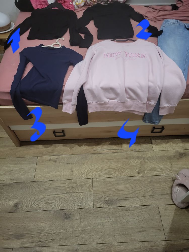 Očitno so zmagale 2. Zdej pa še pulover oz. majco. Ruki so štiri ki bi po mojem mnenju najbolj pasale. 1je kot crop top, pol 2 je kt bodi, tretja je tt k crop top, pulover je pa tak srednje dolgi.