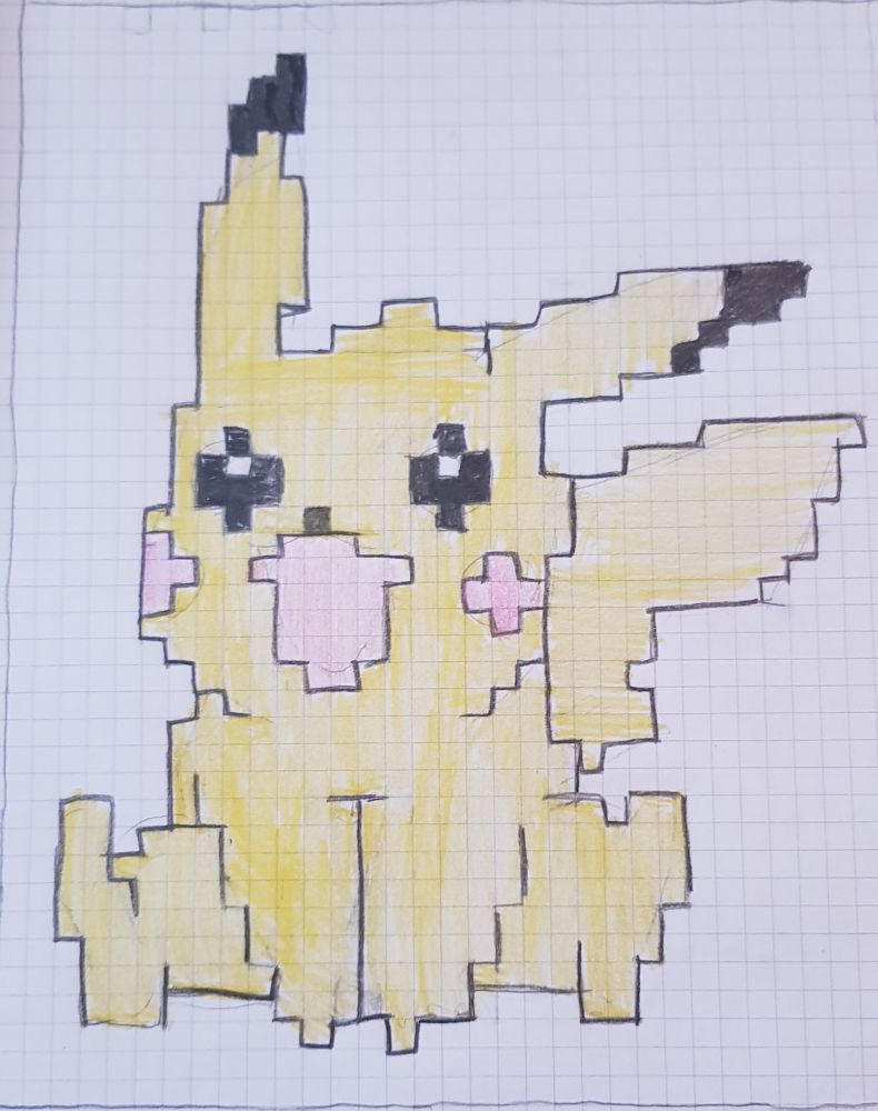 no odločla sm se da začnem s pixel artom (men se zdi da se tko reče:joy::grin::thinking:) in ja vem da ni najlepše pobarvano, ampak to ni point, ker ga bom pol probala nardit v minecraftu (zdj ga ne morm, kr mio je računalnik crknu) no naredla sm ga tko da sm si sprintala enga pikachuja in ga dala pod ta list, pol sm pa prerisala pa tko 'obrisala' da so nastali pixsli. aja pa za pikachuja sem se odločla, kr je ful cute character za risat:grin: