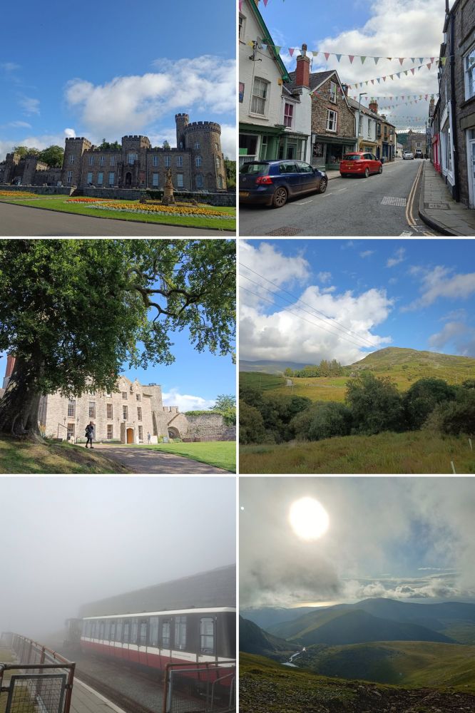 Nato je sledila zelo dolga vožnja (ampak ne po avtocestah :unamused:) do severa Walesa, kjer so se začeli vzpenjati hribi, ki so pomoje visoki ene 800 m večinoma (povsod je pisalo samo v čevljih). V eni vasici s hribi smo se prijavili v naš novi hotel in se peljali do parkinga za Snowdonio. Tam smo šli na fish and chips, ki je kar dobra jed. Potem pa smo šli do želežiške postaje, ki vodi na najvišji vrh Walesa - "gora" Snowdon, ki je visoka pomoje 1085 m (visoko, a ne :joy:). Peljali smo se z diezelsko lokomotivo do vrha Snowdona in vmes je bila lepa pokrajina - *b*slika druga vrsta desno*b*. Peljali smo se eno uro in prišli v meglo :unamused:, tako da razgleda ravno ni bilo - *b*slika spodaj levo*b*. Se je bilo pa lepo peljati nazaj v dolino in gledati, kako se megla spreminja v Sonce - *b*slika spodaj desno*b*. Še na karti: