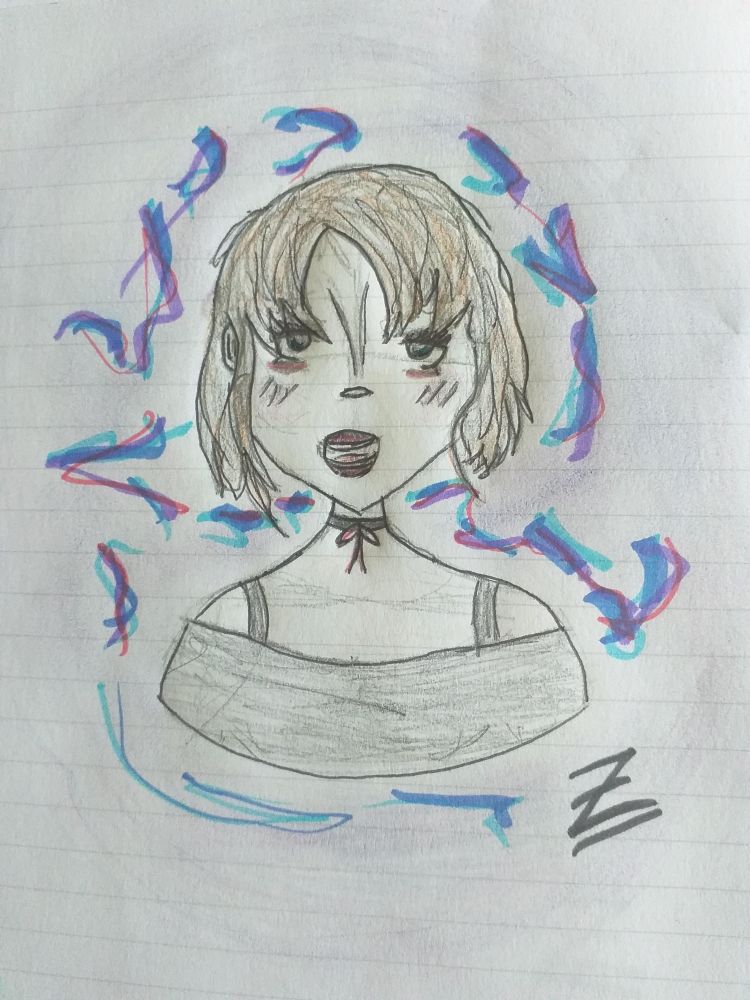 Narisala sem kr eno dekle. Barve so sive zaradi svinčnika. Uporabila sem samo rdečo in svetlo rjavo barvico za ozadje pa flomastre .