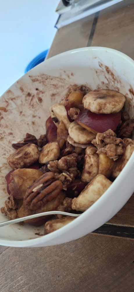 okii guyss js se mam za ucit slovenscino hahah inn js se iskren ne morm ucitt ne da bi kej jedla zraunn hahah:joy: tkodaa tukii mamoo: naktarinoo banano, medd, cimet, kakauu, ameriÅ”ke orehee (ig haha?), mall cokolade gor nadroblenee paa kosmicii:yum::yum: ful je dobrr haha, zraun pa se kozarc vodee, po pa zvezkii in gremooš„²š„³:fire: