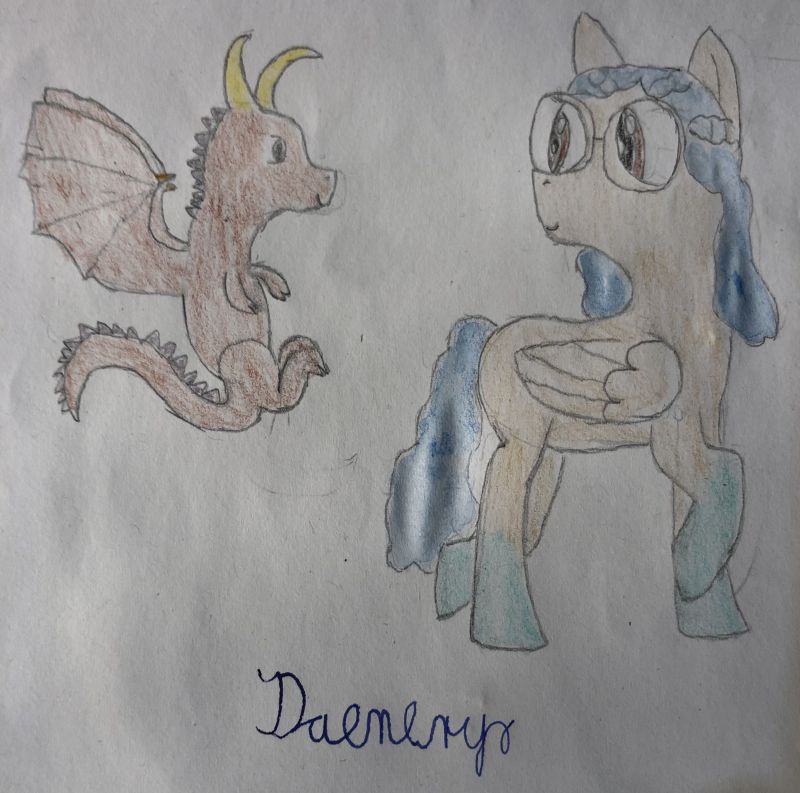 Sicer sem te hotela narisat jutri ampak, potem sem začela risat in se nisem mogla ustaviti:smirk:. Zato torej tukaj je tvoj poni, pobarvala sem ti ga po željah, upam, da se barve v redu prelivajo. Sem pa videla, da imaš rada zmaje:dragon: in sem ti dodala enega za družbo:wink: ( prvič rišem zmaja, oprosti, če je čuden), frizuro pa sem poskušala narediti podobno tvoji princesji soimenjakinji ampak ne vem, če mi je uspelo.