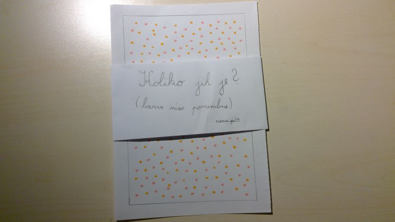 Jaz sem na papir narosala pike, ter jih nekaj prekrila. Ti pa ugani koliko jih je. Tisti, ki bo naj bližje pravemu številu oz., ki bo imel pravo število, bo zmagal. Če trikrat zapored zmaga isti, se nanj naročim in mu lajkam tri objave.