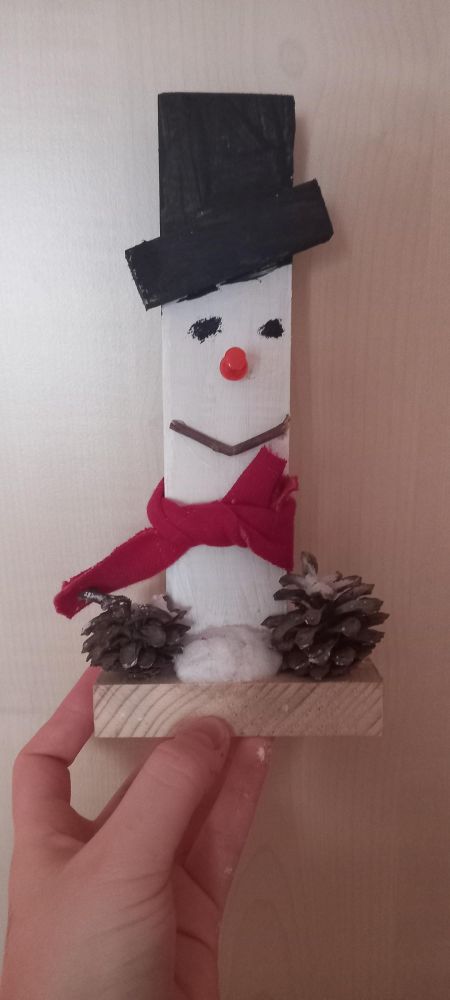 Najprej potrebujete 20cm krat 5cm dolgo desko in podstavek. zlepite jih skupaj, nato pa zgoraj pobarvajte črno (klobuk) ter dodajte mini črno latvico, ostanek pa pobarvajte belo, dodajte kakršno koli dekoracijo, za nos lahko uporabite oranžno buciko, za usta zlomljeno vejo, za šal pa zavezan kos blaga.