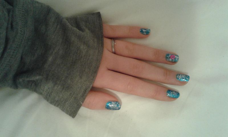 V tem delu sem pisala o zimi, Božiču in Novem letu. Priložila bom še slikico mojih nohtov, ki jih imam trenutno nalakirane v (vsaj pomoje) takem zimskem slogu.