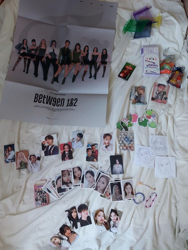 Kupila sem 6 srečk na srečelovu dobila sem pa ful cukra (bonboni, čokolade), fotokartice od raznih idolov, fotokartice (lomo) od skupine Loona, photocard holderje z Nikijem iz Enha pa Txt photocard holder, neke nalepkice.