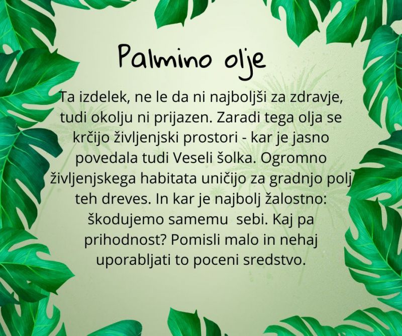 Nov del! Tokrat opozarjam o palminem olju. Še vedno so dobrodošli predlogi za naslednji del. Če ima še kdo željo o obveščanju, naj piše spodaj.