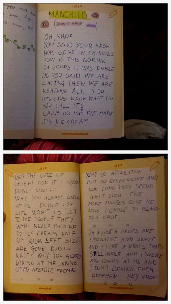 Dubila sem krof in bila sem zelo neustavljiva takrat mi je res pasal.Ta pesem je za vse ki se ne morate upreti rogljičkom in krofom. Zakaj v pesmi rečem KROF in ne dount (ker se tisi večer nisem mogla spomniti angleškega imena za krof :upside_down:)