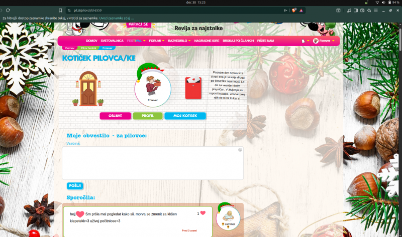 hey meni se je to tudi naredilo enkrat, po tem ko sem objavila neko sporočilo v svojem kotičku (nevem zakaj tho). Uglavnem ugotovi po kjerem sporočilu se je to zgodilo in ga zbriši ali pa počakaj da gre na drugo stran (ko je pri meni šel na drugo stran je bilo potem ok)