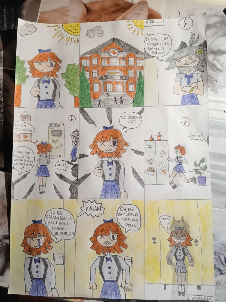 Evo, pa sem se le spravila delati strip, ki govori o najstniški pošastki, ko jo imajo za izobčenko. Torej je strip na temo "stiska", saj se počuti izključeno in ničvredno zaradi tega, ker je nihče ne mara - saj ima slabe ocene in je zato drugačna od ostalih, tako rečeno boljših od nje. Hvala, če boste strip prebrali in uživajte v prvem delu!