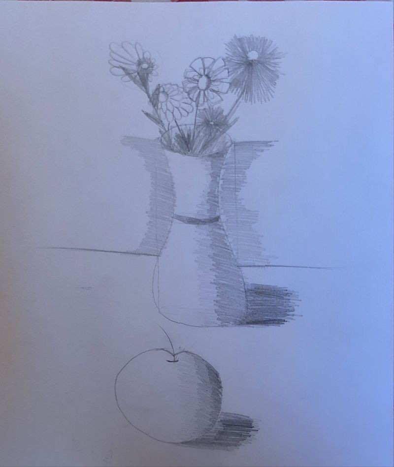 Živjo, narisala sem vazo z rožami in jabolko ter ju osenčila! :grinning: