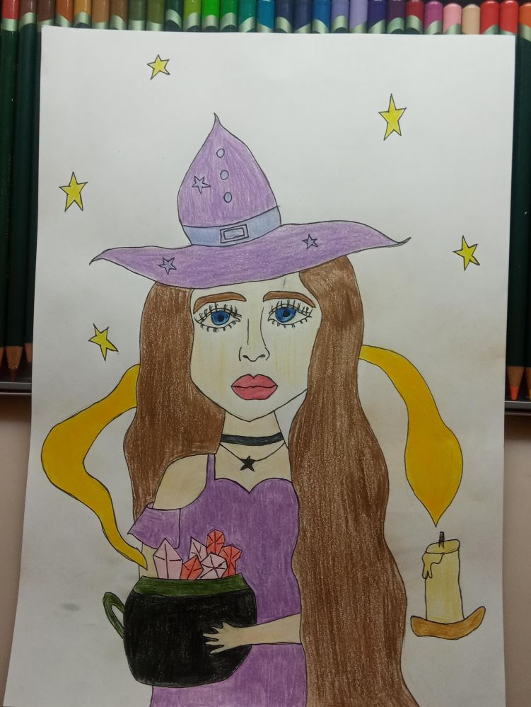 kakorkoli na sliki je čarovnica (vem, šokirani ste, da ste to zvedli haha) v rokah pa drži neko posodo v kateri so diamanti in kristali. zraven je neka čarobna leteča sveča in ja.