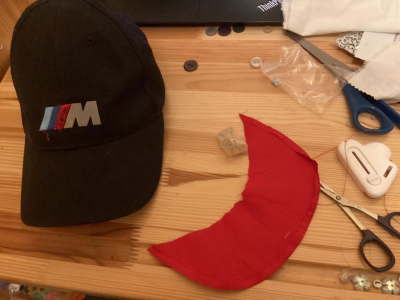 Rabla sm odstrant spodnjo stran (ker je bla živo rdeča) in rabm še robove zalept, logo bom probala nekak odstrant ker se bo pomoje vidl čez ta bel blago čez. Jutr bom probala našit vse stvari na belo blago (k ga bom kasnej našila na kapo)