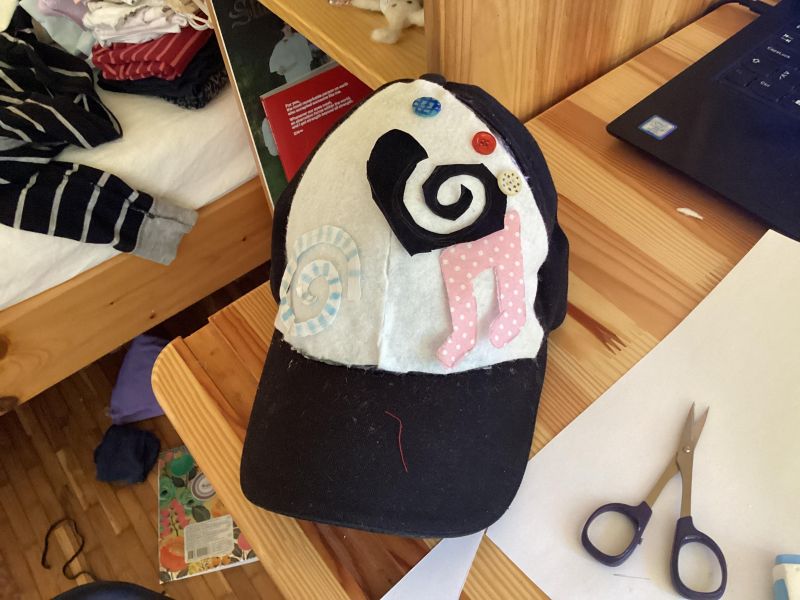 okey zdej sm zalepla robove odspod kape (tm kjer sm v prejšnjem delu odstranla rdečo, in nalepila bel filc (ta bel blago k bo šel čez je precej prosojen tk da sm rabla še neki odspod)