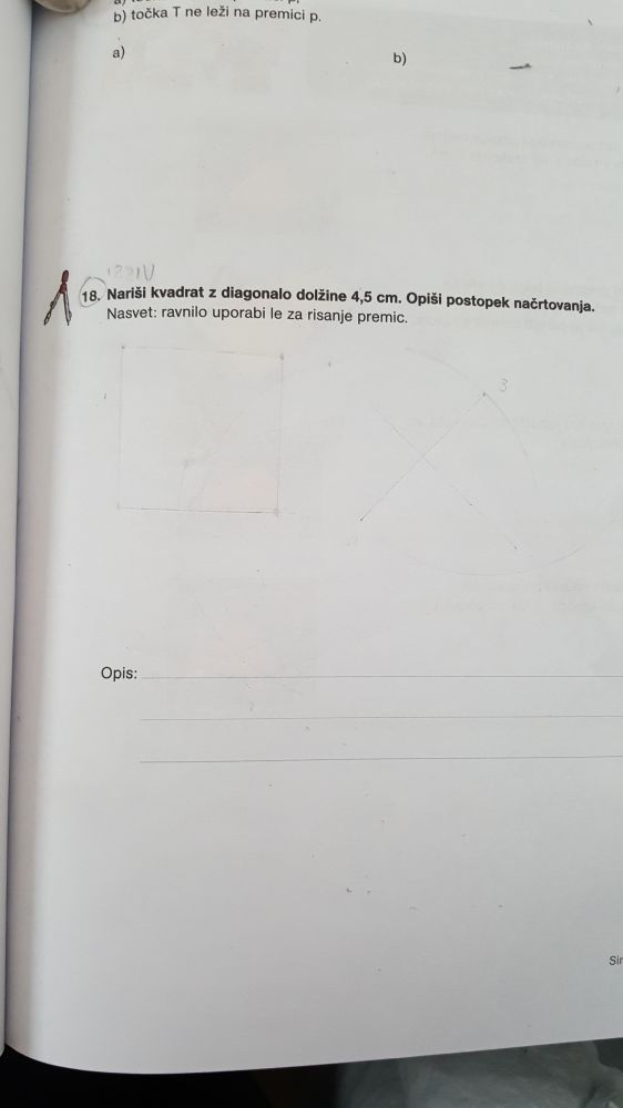 Vzemi geotrikotnik in od 0 nameri 4 cm in še pol. Nato nariši poševno črto s tako dolžino (4, 5 cm) in iz tega lahko narišeš kvadrat.