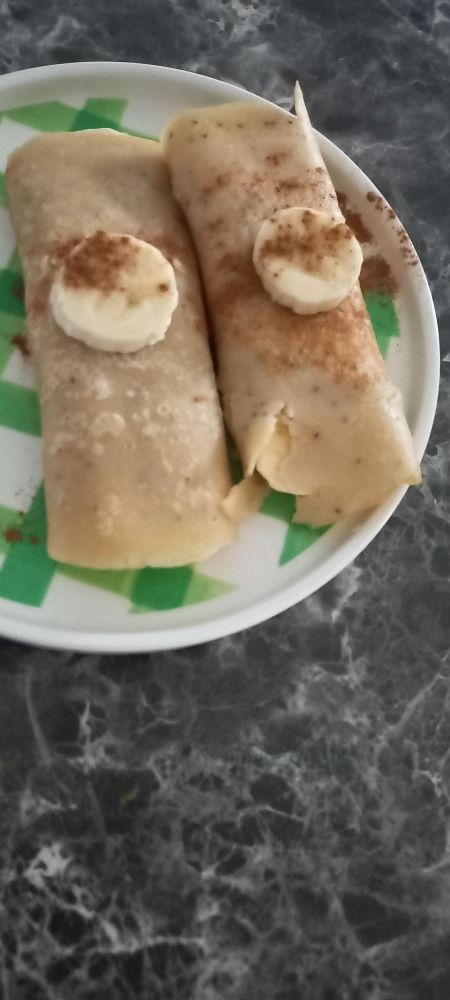 Najprej zmešaš moko in rastlinsko mleko/napitek. Dodaš žličko chia semen in premešaš. Ponev namastiš s kokosovim oljem in maso postopno vlivamo v ponev in pečemo. Medtem narežemo eno banano. Ko so palačinke pečene jih nadevamo z banamo in posujemo s cimetom.