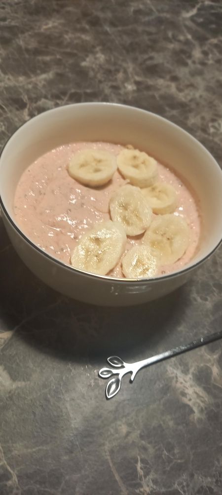 Vse sestavine razen banane damo v mešalnik in 'miksamo' do gladkega. Pomembno je, da v pudingu ni koščkov zmrznjenega sadja. Nato mešanico prelijemo v skodelico in damo v hladilnik čez noč. Zjutraj narežemo banano, jo položimo na puding in uživamo.