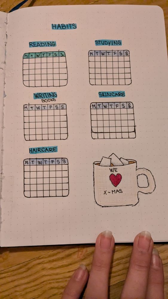 tuki je za habits. not sm dala sam branje, pisanje, skincare, haircare pa učenje. pa pr uni šalci z vročo čokolado sm hotla napisat new year, pa sm se zmotla.