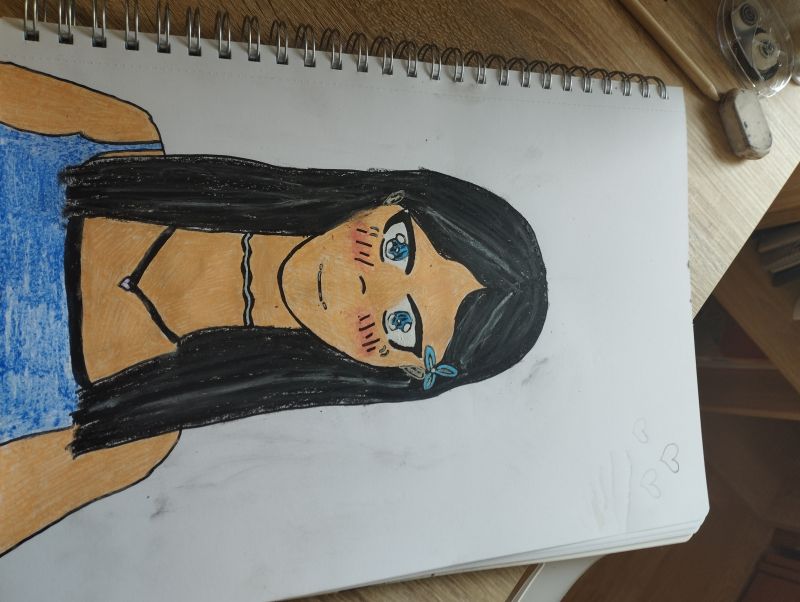 prilagam sliko anime punce ki sem jo narisala po domišljiji. Uporabljala sem voščenke in posca markerje. Se opravičujem ker je ob straneh risbe malo razpackano od voščenk.:sweat_smile: