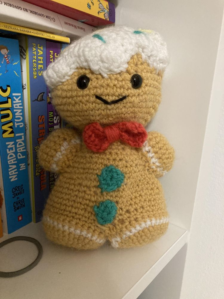 Že pred nekaj časa sem skvačkala gingerbread man-a. Uporabila sem ta patetn: https://yumyarn.wordpress.com/2018/10/28/gingerbread-man-pattern/ .