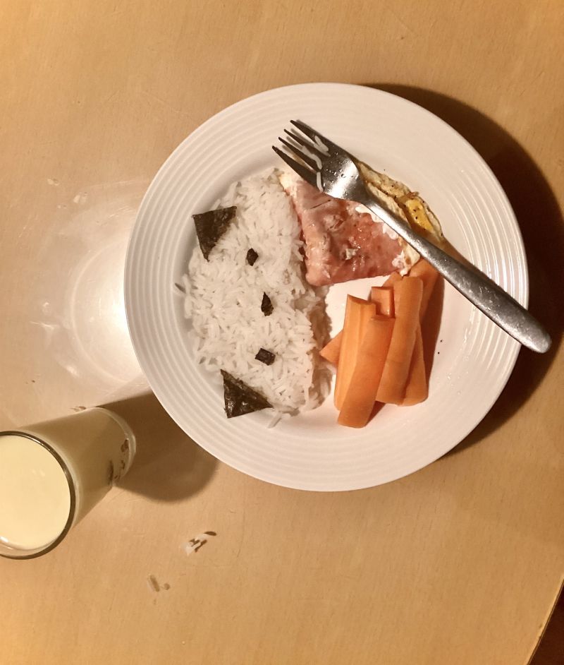 Tole je moja večerja: riž, korenček in jajce s pršutom:rice::bacon::cooking::carrot: