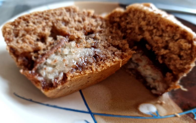 jajca, sladkor, melko in stopljeno maslo zmešamo. dodamo presejano moko s pecilnim praškom in kakav. čokoladice bounty prerežemo na pol, tako da dobimo pol čokoladice za vsak mafin.
