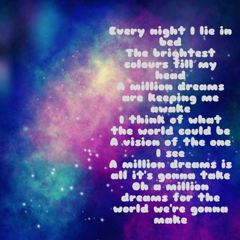 Hej... Tukaj je moja naloga. Kitica je iz pesmi A Million Dreams. Cela pesem ima kar lep pomen. Zato sem izbrala to pesem. Oprosti, ker naloge nisem prej oddala ampak nisem imela časa. Bila se v Bohinju. Oprosti.