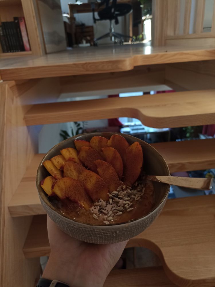 podoben kot dva dni nazaj in sicer grški jogurt s čokoladnim proteinskim praškom, sončnična in chia semena, med, cimet in nektarina :)) zelo okusno in obožuuuuujjeeemmmmm nektarine, vsi pa poznate mojo obsesijo s cimetom