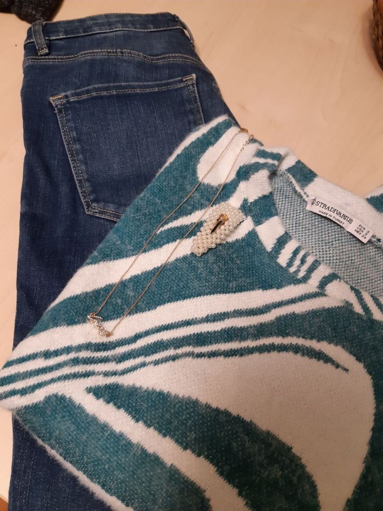 Tukaj je moj outfit za jutri. Oblekla bom navadne jeans hlače in bel pulover s turkiznimi vijugastimi črtami. Kot dodatek sem izbrala zlato verižico z napisom love in špango z majhnimi belimi perlicami.