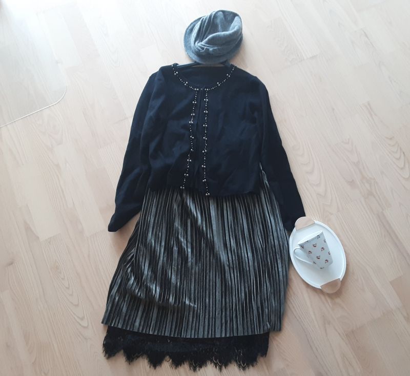 evo, mela bom navadno črno majco in bež žabe( ni na sliki), pol pa tole jopco, klobuček, spodi pa figo in pa krilo, ki se obrne in bo druga stran v drugi objavi. tm bo še plašč, ki ga dam čez. za premik ne bom babi, ampak fina dama.