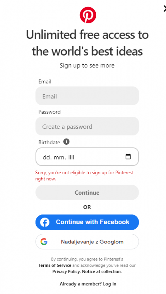 Mogoče nisi dovolj stara, mislim, da ima pinterest starostno omejitev.