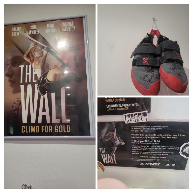 odločla sem se da bom pokazala vse stvari ki jih imam od plezanja. Na sliki so plezalke s podpisom od Janje pa plakat in povabilo na predpreimero njenega filma The Wall climb for gold.