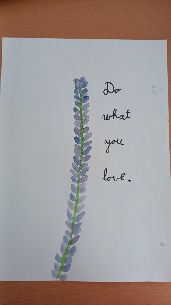 Kjut! Samo najbrž bi ful lepš izpadlo, če bi dorisala še eno sivko in bi se mby križali (upam, da veš kaj mislim) in v ozadje bi lahko npr. vzela čopič in pomočila v vijolično barvo (lahko je tempera- a more biti tko bolj vodena- lahko pa uporabiš vodene barvice (upam, da sem prav napisala, ker tega nisem že tok let uporabljala haha) in pač pomočič čopiš v barvo in potem greš s prstom po čopiču, da nekako razpšiš te kapljice barve po papirju in nastanejo pike. Če ni dovolj razumljivo napisano, povej pa bom poskusila še enkrat razložiti. Pa pri quotu, se vidi svinčnik.. to bi bilo potrebno poradirati, a pazi, da ne raztržeš papirja, in da ne greš prevečkrat z radirko čez napis, ker nekateri flomastri/vodoodporci se pol tko razpackajo oz. se začne trgati. Upam, da ti to kaj pomaga pri izboljšanju tvojega izdelka, mi je pa všeč, da se preizkušaš v umetnosti ;)