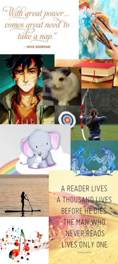 Knjige predstavljajo velik del tvojega življenja in ena izmed tvojih najljubših zbirk je Percy Jackson in Olimpijci, zato je na kolažu Percy, knjige in pa eden izmed bolj znanih citatov Ricka Riordana.